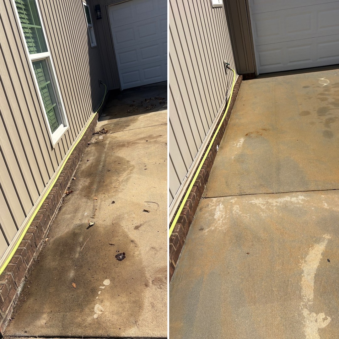 In addition to the house wash, we performed a deep concrete cleaning on the driveway, walkways, and other hard surfaces. Years of embedded stains, algae, and discoloration were removed using professional-grade pressure washing equipment and surface cleaners. The concrete was restored to a clean, uniform finish, improving both safety and appearance by eliminating slippery buildup.