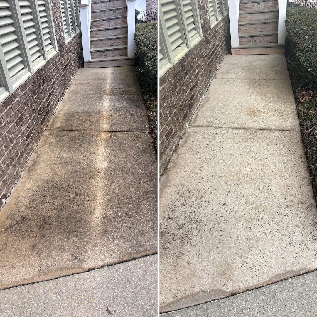 Rust stains on concrete can be especially difficult to remove without professional treatment. Using specialized solutions designed to break down oxidation without damaging surrounding surfaces, the crew safely lifted deep discoloration from walkways, entry areas, and exterior concrete features. The concrete cleaning process also removed years of built-up grime, mildew, and environmental residue, leaving surfaces looking bright, uniform, and like new again.